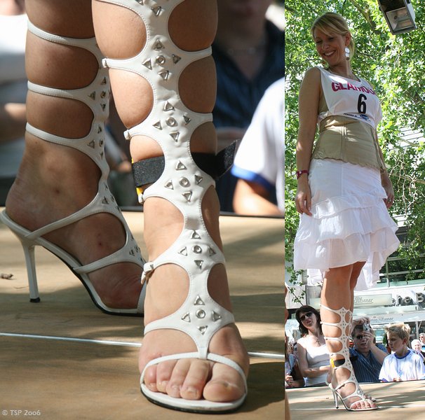 | Die Modezeitschrift GLAMOUR veranstaltete am 19. August 2006 in Berlin im Rahmen des "Global Fashion Festivals" einen spektakulären Damen-Wettlauf. Gelaufen wurde nicht in bequemen Sportschuhen, sondern auf Stilettos mit Absätzen von mindestens 7 cm Höhe und maximal 1.5 cm Breite. Ein "Stilett" ist ein langes, spitzes Messer - auf dessen gleichnamigen Schuhabsätzen sich, außer dem Modelcoach Bruce Darnell, wohl kein Mann fortbewegen kann. Für die elektronische Zeitmessung erhielten die 100 Läuferinnen dann noch ein Chip ums Bein. |