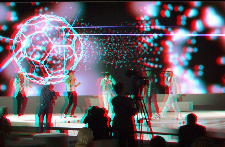| Die Arena für Artisten besteht auf der IFA aus einer Mauer von Flachbildschirmen und einem Zaun an aufgeständerten Shutterbrillen. Dahinter fällt es dem Publikum jedoch schwer, sich mit seinen Blicken, für eine der angebotenen Realitäten zu entscheiden. Neue 3D-HD-Kameras mit Superzoom zeigen Details die mit bloßen Augen schon aus kurzer Entfernung kaum noch wahrnehmbar sind. |
